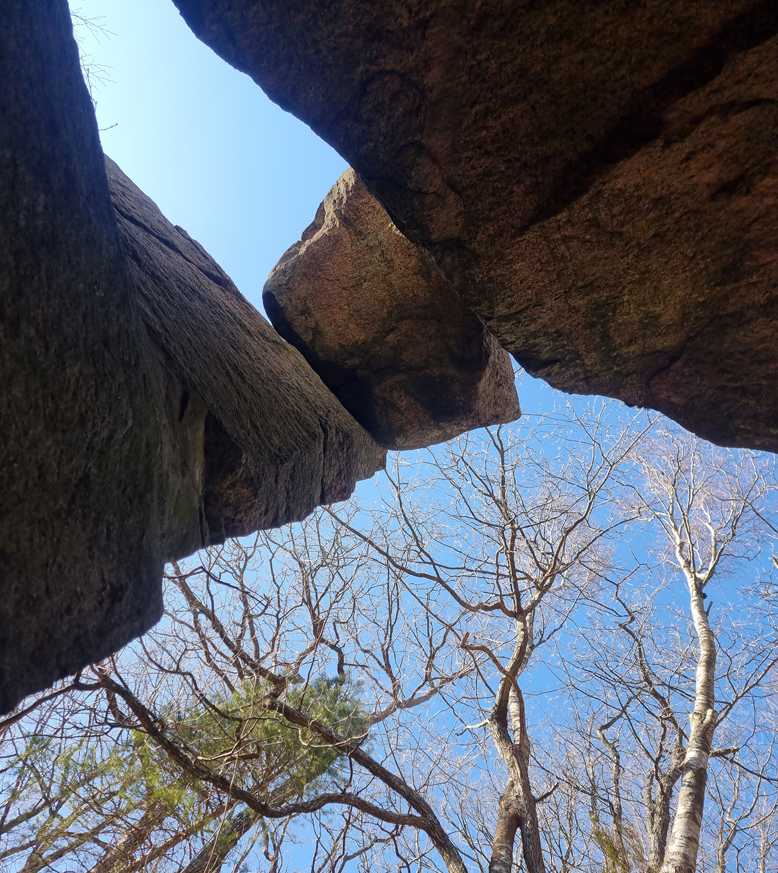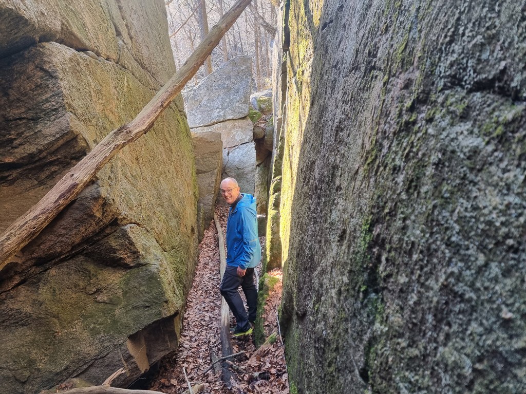 Løypa til venstre er går rett frem. Den til høyre går rett opp. “Vi går til høyre” sa Øystein. Det ble 4 kilometer før vi kom til Øyliheia. Turen rundt Fiskåvann er fin den, men det er nesten like mange høydemeter som lengdemeter. Opp og ned, opp og ned. Fjellskorter og bratte stier. Underveis passerer du Fiskåvann Bolten. Mange har blitt fotografert oppå den. Men har du tid så ta turen ned under den også. Smale fjellsprekker leder inn til en liten heller under bolten. Men gå ned i bunner og bakveien opp under bolten. Det er litt skummelt å klatre ned ovenfra.