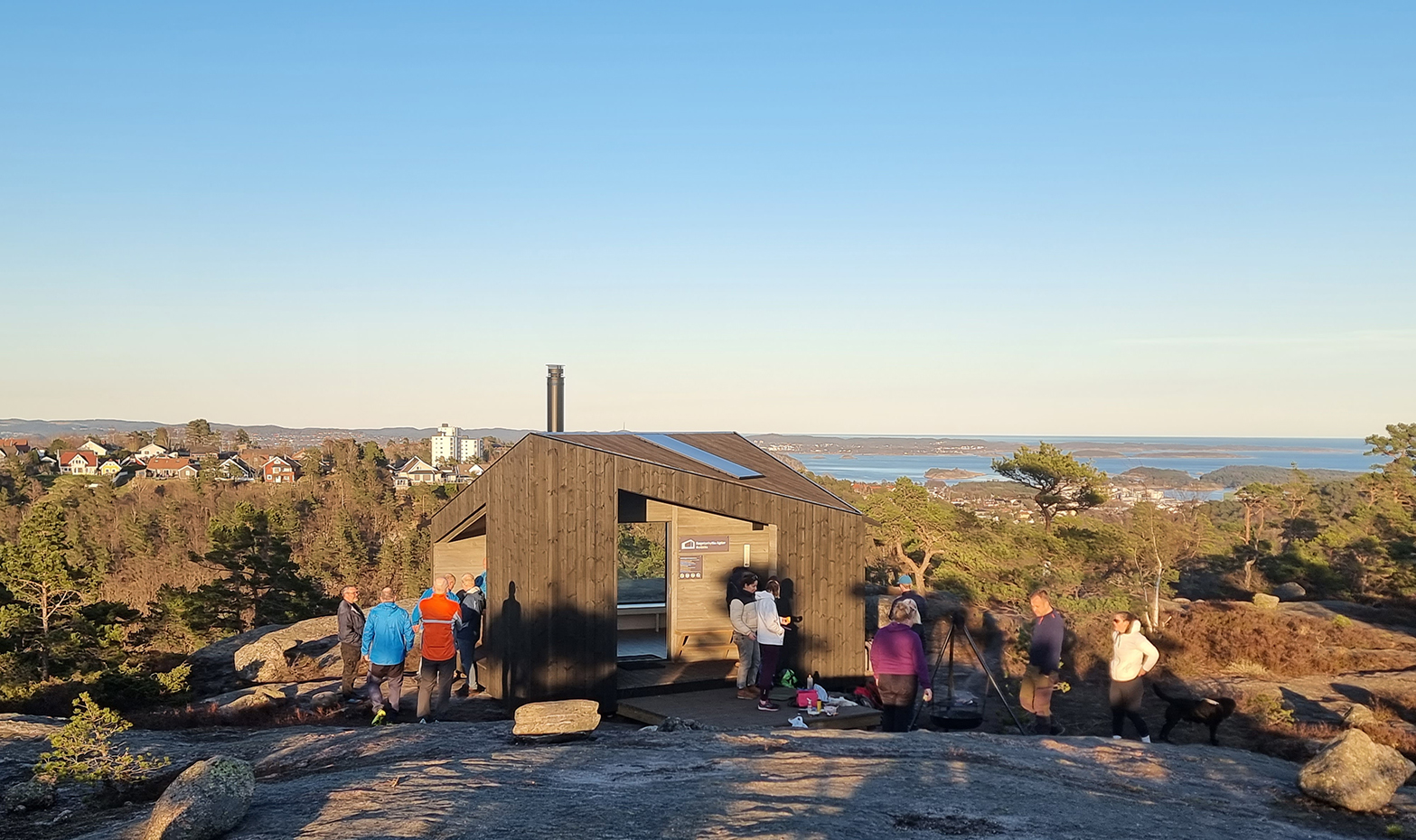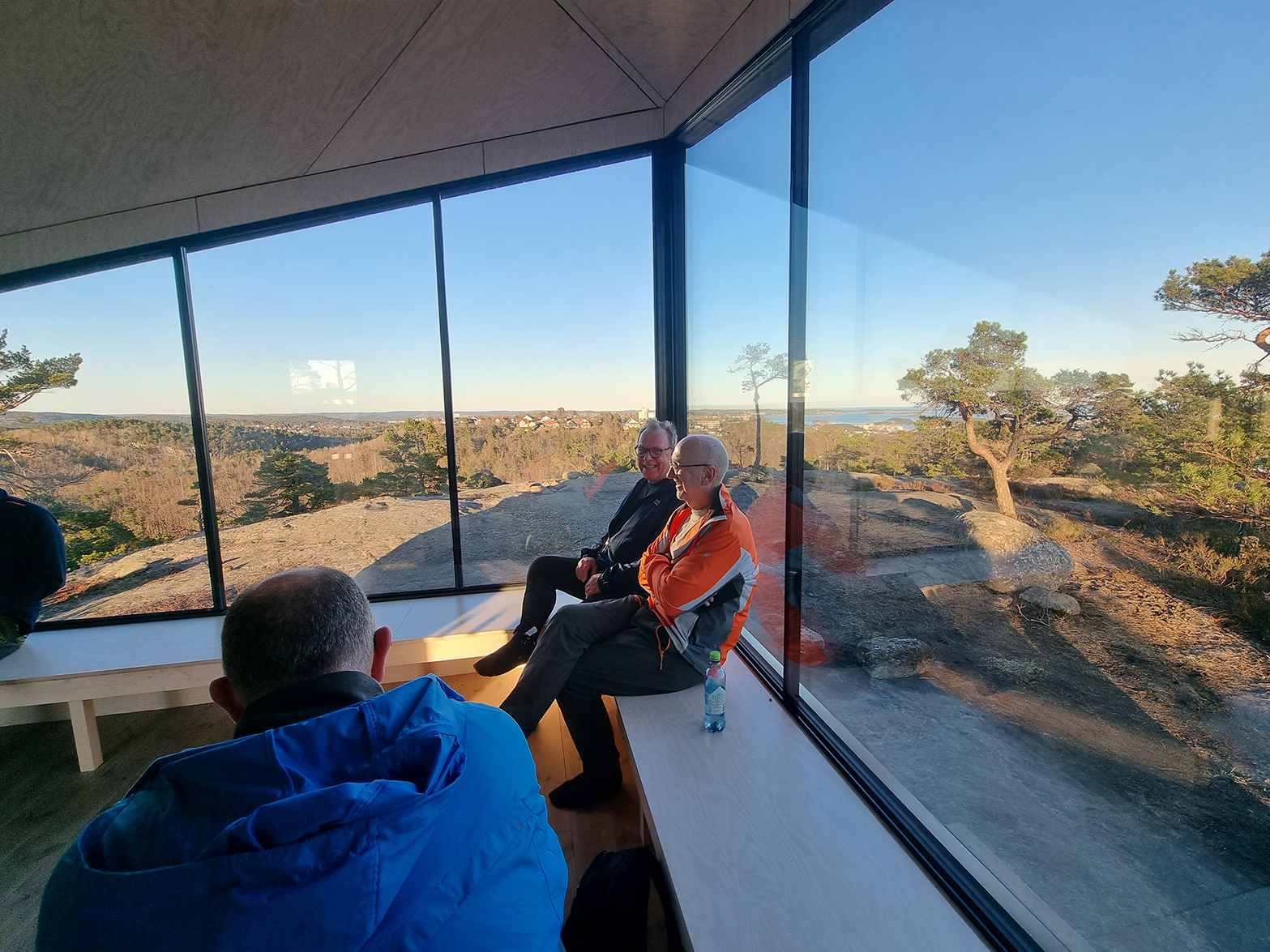 Vi var ikke alene der oppe. En gjeng unge voksne grillet pølser og koste seg utenfor denne vårkvelden her oppe. Vi gikk inn i hytta og nøt utsikten. Husk å ta av deg skoene når du går inn.