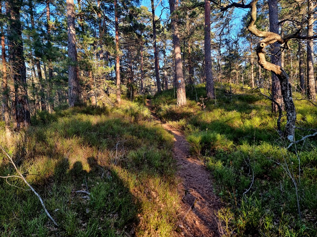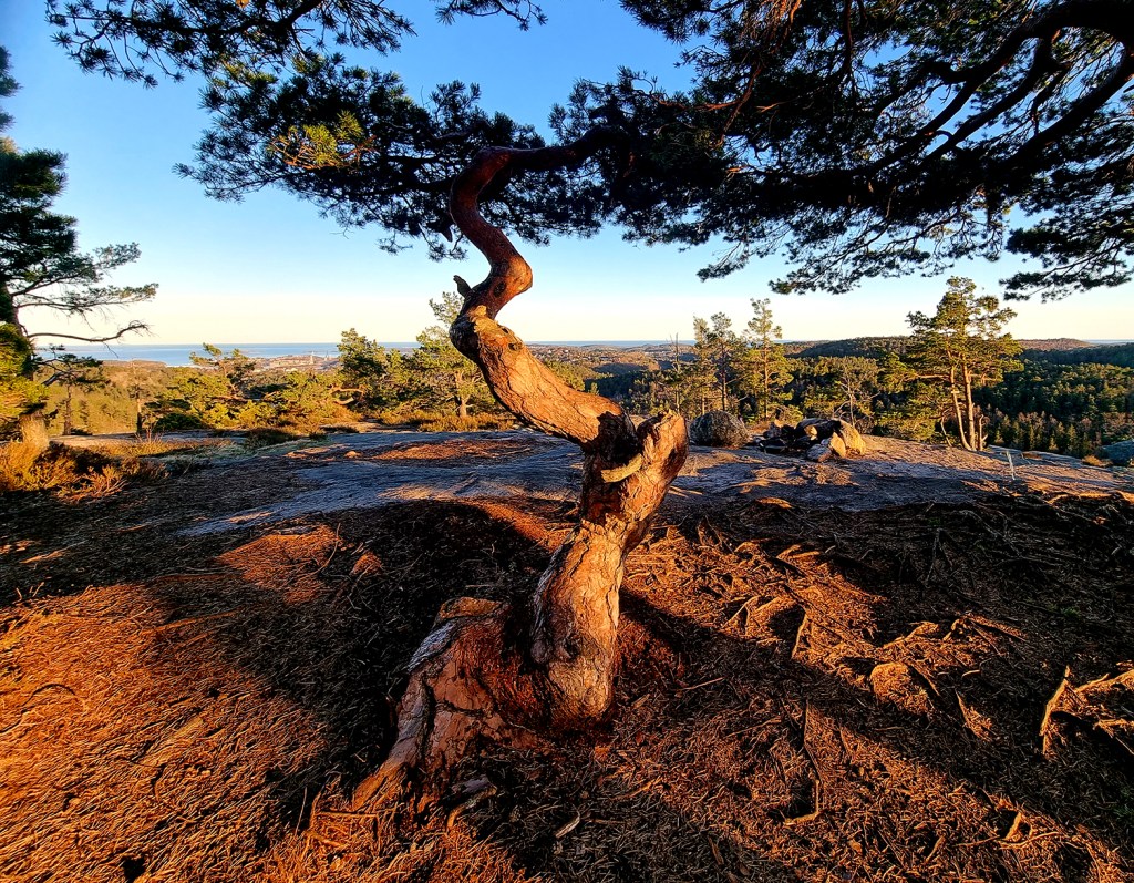 I tett skog gikk en brei sti oppover og oppover. Tung start for en som helst vil hjem til sofaen. De andre prata. Jeg pusta. Men litt etter litt så jeg lyset, for litt etter litt kom vi høyere, og litt etter litt ble det lengre mellom trærne. Sola skinte fra skyfri himmel og plutselig var vi oppe. Jeg våkna til der oppe på Sovehei. For her var det flott. Store åpne partier med Furuer som har vært ute ei vinternatt før og stått mot noen stormer. Vridd av vær og vind. Lyngkledde moer og nakne fjell. Litt høyfjellsfølelse her oppe. Sovehei var flott. Turen gikk videre på myke stier og over broer på våte myrer. Turlaget har gjort en solid jobb med merking og snekring på denne løypa. Og målet vårt; Olashei, var like fint og åpent. En har utsikt her oppe. Tror vi så Homborsund fyr langt der borte. Naturen spretter ut og bjørkenes lysegrønne ferske blader er fine i kveldssola.