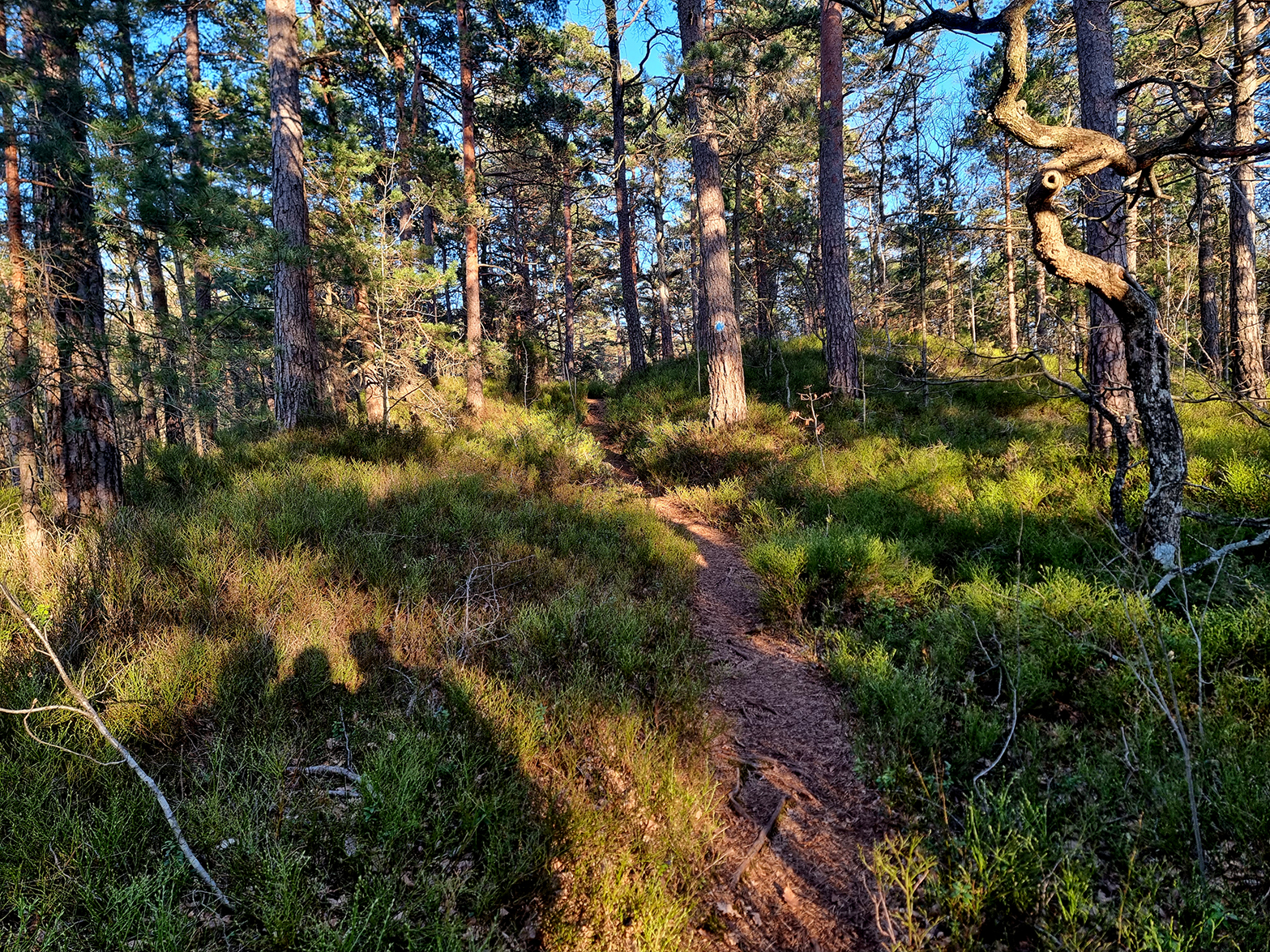 Kvelds-sol-skogen er fin. Lange skygger og lange solstråler lyser opp naturen som tar sats. Stiene er fine og godt skiltet.
