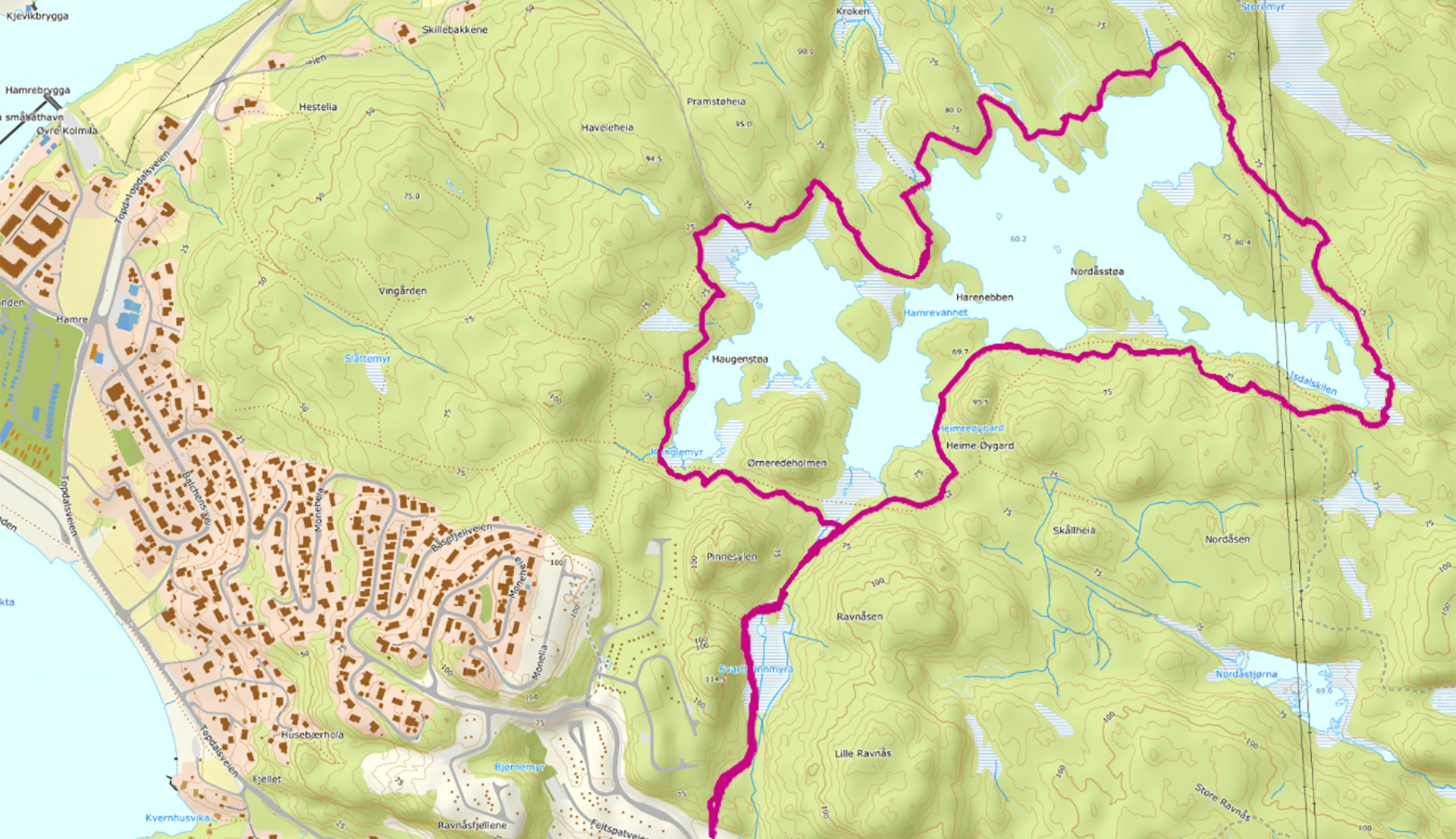 Det er fint rundt Hamrevann. Et vann spekket med viker og bukter. Et vann som nå har fått en flott sti rundt det hele. Stien er ny og fint ryddet. Blå merker er lette å følge. Og det er en mjuk tur. Stiene er så nye at steiner og røtter har ennå ikke blitt nedtråkket. Det er heller ikke så mye opp og ned som det ofte er på våre mål- og meningsfulle vandringer. Dette er en lavterskeltur slik en lavterskeltur skal være. Og finere blir den. Mange broer og gangveier over blaude myrer finnes allerede. Og flere kommer.